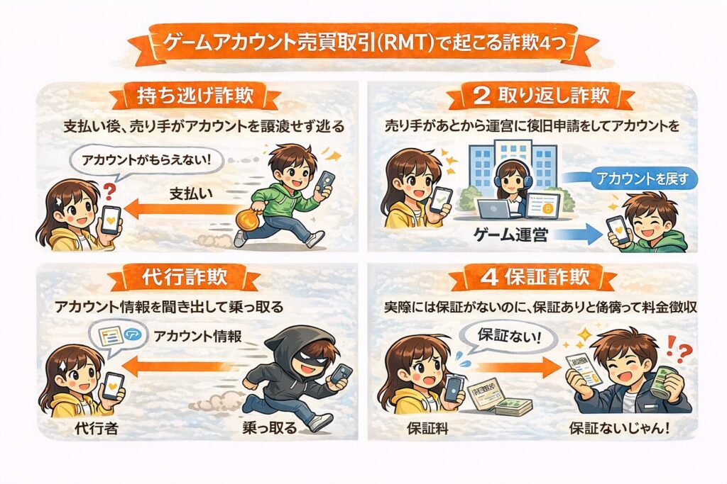 ゲームアカウント売買取引(RMT)で起こる詐欺の種類4つ