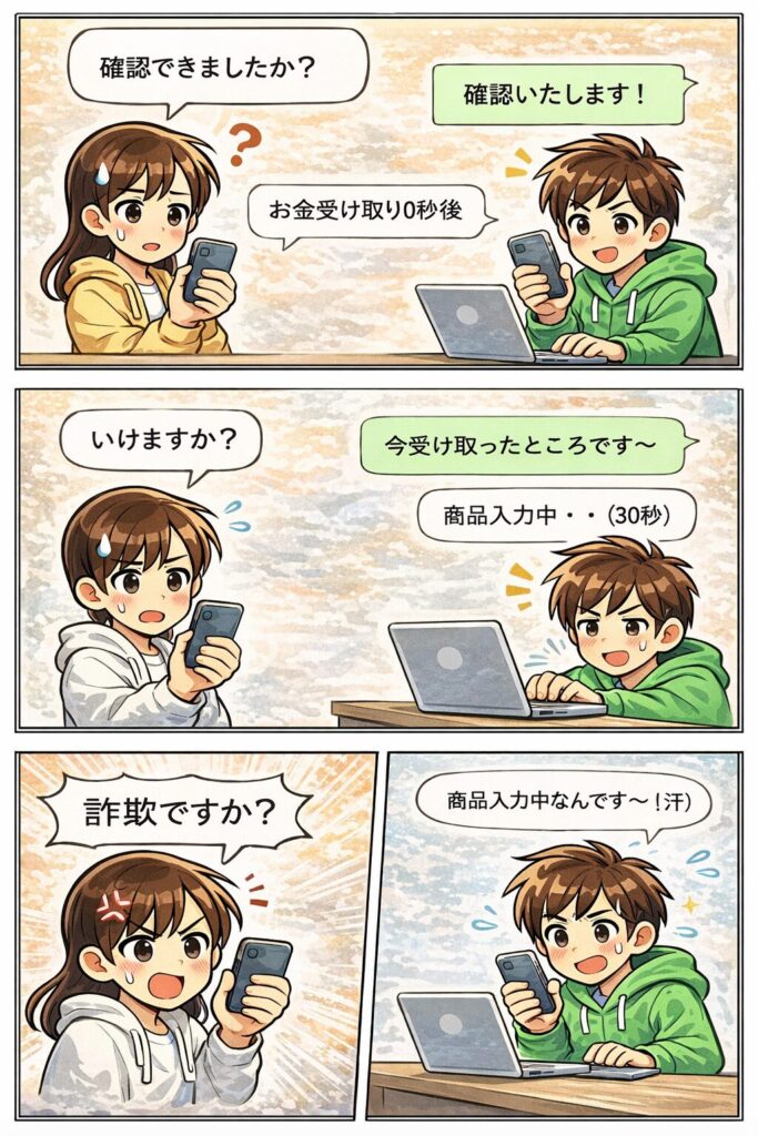 販売者にとって、詐欺を疑われるということは気持ちの良いものではありません。疑う相手なら取引してもらう必要はないと感じます。