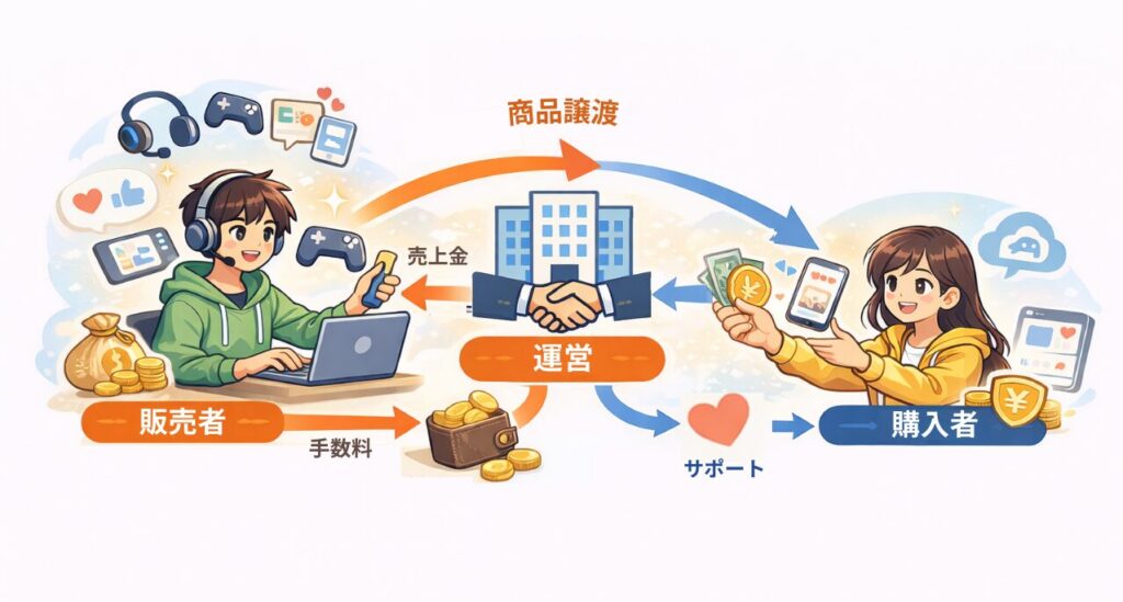 お金やアカウントは一旦仲介が預かって確認します。商品を渡す前に先にお金を受け取れないので、詐欺が起こりにくくなります。