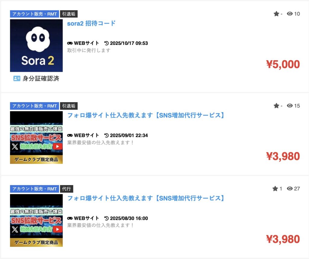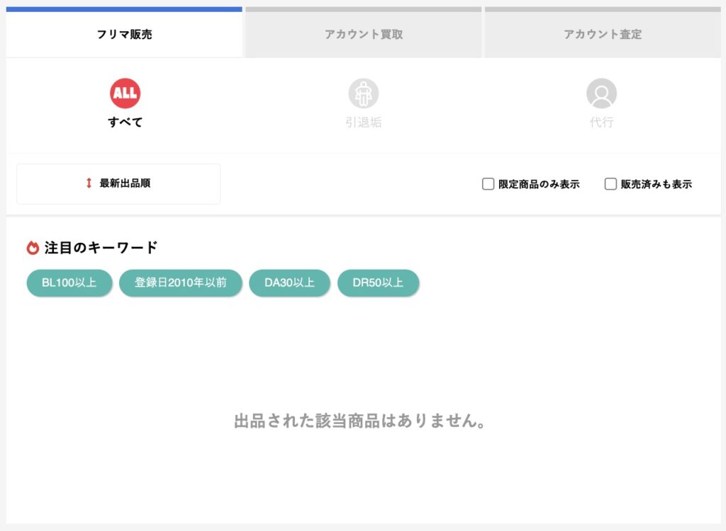 | 取扱商品 | ・SNSアカウント/代行 ・ゲームアカウント/代行 ・Webサイトなど | ・SNSアカウント/代行 ・Webサイト ・中古ドメイン |