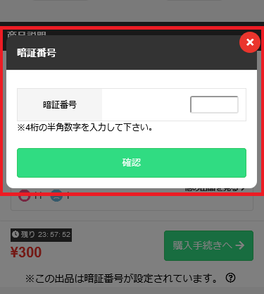 暗証番号を設定している出品には鍵マークがついています。詳細画面では「※この出品は暗証番号が設定されています。」と表示されています。