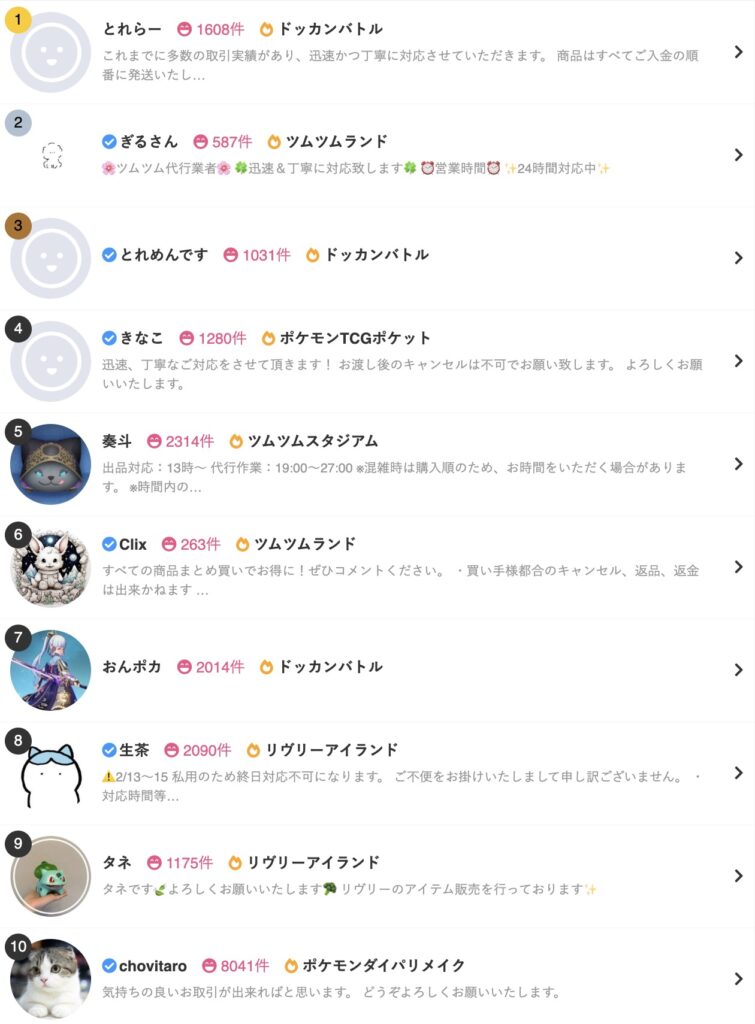 参考までに販売ランキング1位~10位までにランクインしている売り手の名前をあげておきます。
