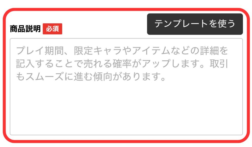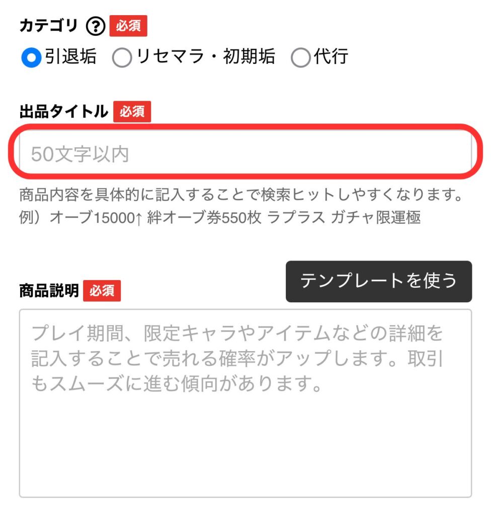商品タイトルは短いため、検索されやすいアイテム情報などを記入しましょう。ゲームタイトル名や「売ります」の文言はなくても売れます。