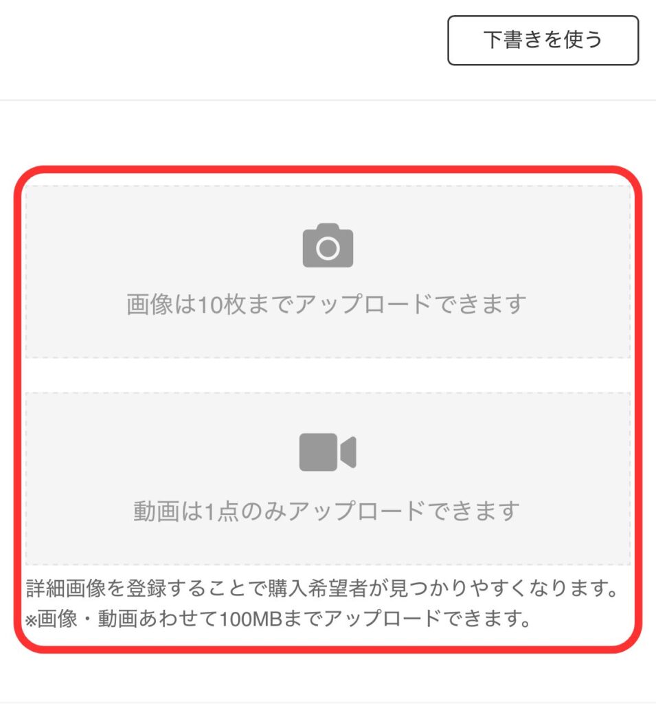 商品の内容がわかる画像や動画をスクリーンショットや画面収録などで撮影します。画像は最大10枚まで載せられます。