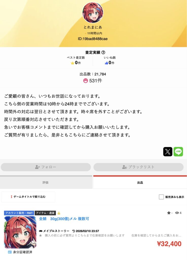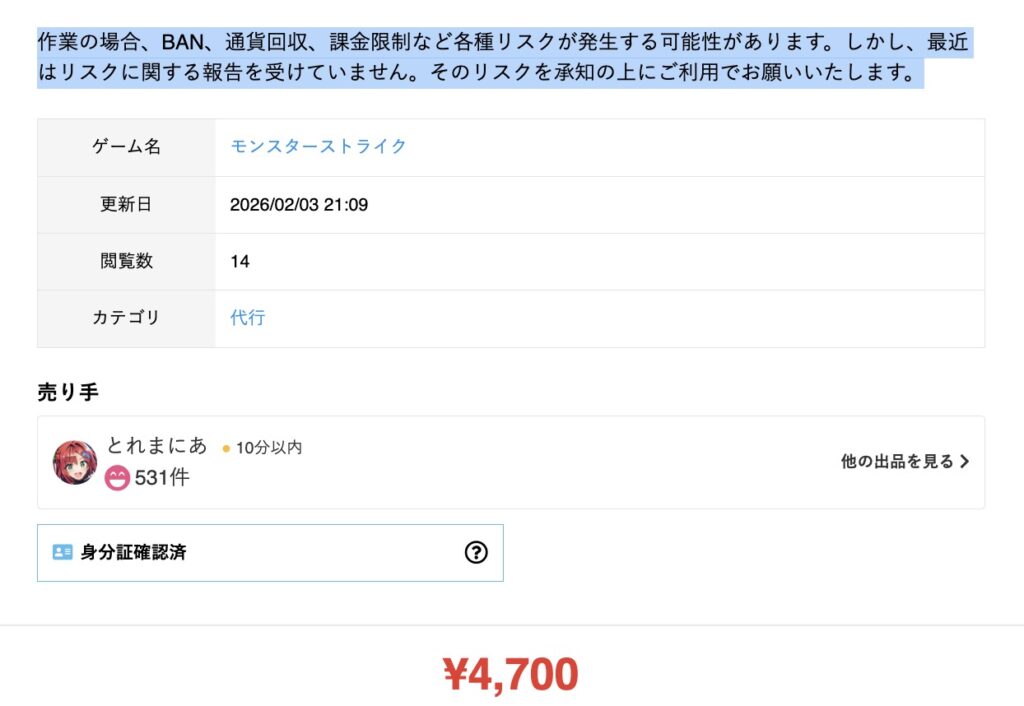 400件以上取引実績がある業者アカウントです。課金代行がメインで大量に出品されています。