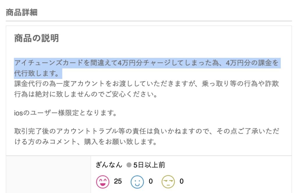 しかし、商品説明文を見ると「アイチューンズカードを間違えて4万円分チャージしてしまった為、4万円分の課金を代行致します。」と買いてあったため、正規の代行であることがわかります。