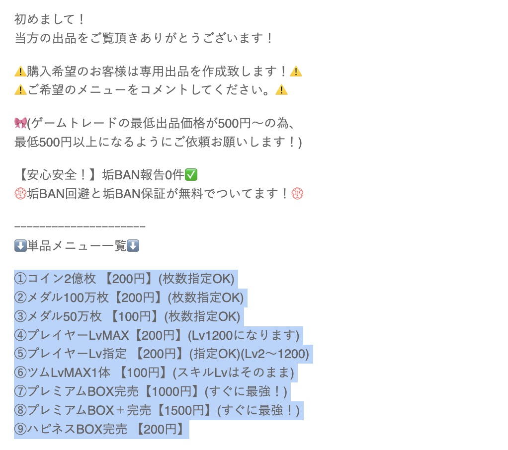 ゲームトレードではチート商品の販売は禁止されています。不正な出品を無くしていくには1人1人の報告しかありません。